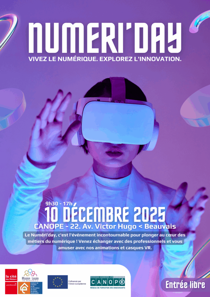 Organisé par la Mission Locale et la Cité des Métiers du Grand Beauvaisis, le Numeri’Day est l’événement incontournable pour tous les publics – jeunes en quête d’orientation, demandeurs d’emploi, professionnels curieux ou simples passionnés de technologie. Notre objectif est clair : mettre en lumière les carrières d’avenir et l’innovation foisonnante de notre territoire.